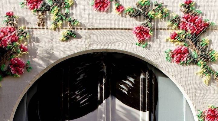 In whatever way the inspiration came to her, Raquel Rodrigo is embroidering buildings. Or rather, she’s installing large cross-stitched pieces on buildings. She uses the same technique you do, but her “cloth” looks like the large mesh you might use to hold up a tomato plant in your garden, and her “embroidery thread” looks like colorful rope.