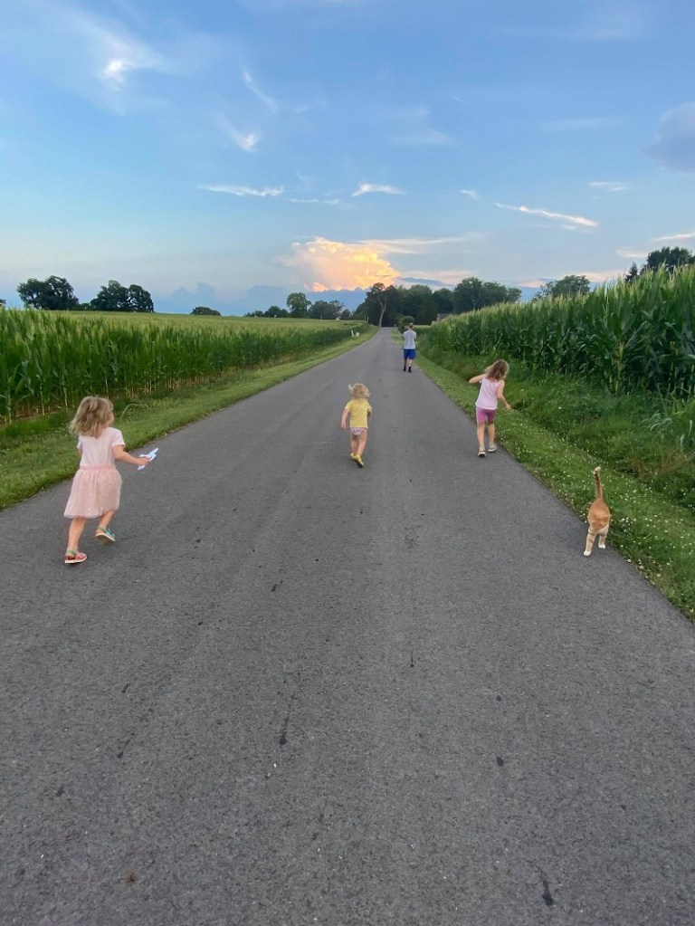 Sister Mary and Nun Anna took the girls on a walk by the corn fields. The sunset was beautiful, and the dandelions were fluffy.