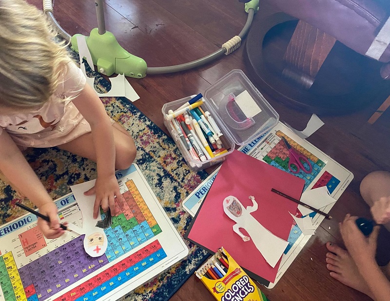 With great joy, let me introduce you to two little nuns and the little girls who made them. The nuns began life on a summer day, on the carpet with markers, colored pencils, and two fascinating copies of the Periodic Table of Elements.
