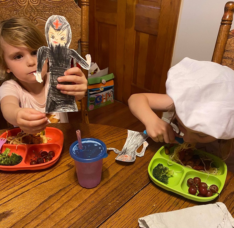 Sister Mary and Nun Anna spent a wonderful day with Big and Little Sister. They ate spaghetti, and it is very likely they also ate their vegetables. Nuns do eat vegetables.